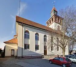 Die Kirche im Ortskern von Binzen steht südlich zur Durchgangsstraße etwas erhöht zu den sie umgebenden Wohnhäusern.
