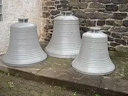 Die Kirche beherbergt ein Dreiergeläut. Mitte des 19. Jahrhunderts waren eine Glocke von Johann Peter Bach (Windecken 1763), von Johannes und Andreas Schneidewind (Frankfurt 1714) sowie eine mittelalterliche Glocke, die aus dem Kloster Arnsburg übernommen war, vorhanden.[13] Zwei gesprungene wurden 1896 durch Glocken von Franz Schilling und Karl Friedrich Ulrich ersetzt und mussten im Ersten Weltkrieg als Metallspende abgegeben werden. Die dritte Glocke, die Friedrich Otto in Gießen 1855 umgegossen hatte, wurde 1920 verkauft. Mit dem Erlös wurden im selben Jahr drei Stahlglocken angeschafft, die als Gemeinschaftsarbeit von Buderus und Rincker entstanden.[14] Die größte (1,10 Meter Durchmesser) hatte den Schlagton gis1 und trug die Inschrift: „In schwerer Zeit dem Herrn geweiht, Herr hilf und jetzt und in Ewigkeit.“ Die zweite (0,86 Meter Durchmesser) mit dem Schlagton h1 hatte als Inschrift: „Gerechtigkeit erhöht ein Volk, aber die Sünde ist der Leute Verderben.“ Die dritte (0,76 Meter Durchmesser) mit cis2: „Wer aber beharret bis ans Ende, der wird selig.“[15] Damit waren die Glocken im Te Deum-Motiv gestimmt. Das Geläut wurde 1962 elektrifiziert. Im Jahr 1993 wurden die Stahlglocken aus klanglichen Gründen vom Turm geholt und durch drei Bronzeglocken der Firma Rincker im gleichen Motiv, aber der um einen Halbton höheren Tonfolge a1-c2-d2, ersetzt.