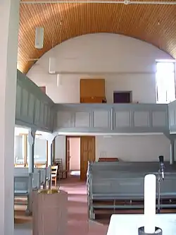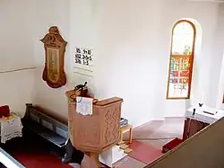 Die Kirche ist ein verputzter Bruchsteinbau mit 14,50 m Länge, 9,20 m Breite und 5 m Höhe im Kircheninneren. Das Kirchenschiff mit rundbogiger Holzdecke wurde 1716 in der gleichen Größe wie der Vorgängerbau erbaut. Der etwas ältere flachgedeckte Chor stammt wohl aus dem Ende des 17. Jahrhunderts. Die Kirche besitzt eine steinerne Renaissance-Kanzel von 1682 mit beachtlichen Reliefverzierungen im Stil von Metallkartuschen, einer Rosette und zwei grotesken Masken.[1]