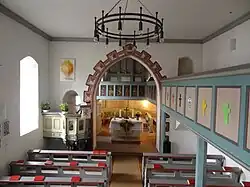 Der Innenraum des Kirchenschiffs wird von einer flachen Decke abgeschlossen. Die Rippen des Kreuzgratgewölbes im Chor sind aufgemalt und wurden im Jahr 1962 restauriert.[6] Zum Westen hin ist eine hölzerne Winkelempore eingebaut, die auf sechsseitigen Holzpfosten ruht, die blau marmoriert bemalt sind. Die Emporenbrüstung hat kassettierte Füllungen.