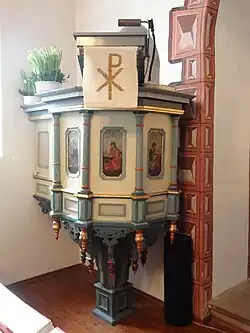 Die hölzerne polygonale Kanzel in der Nordost-Ecke der Kirche datiert vom Ende des 17. Jahrhunderts. Sie ruht auf einer profilierten Holzsäule und schließt oben mit einem profilierten Gesimskranz ab. Die Kartuschen der Kanzelfelder zwischen runden Ecksäulen zeigen Malereien der vier Evangelisten. Eine grob gehauene rundbogige Öffnung in der Chorwand verbindet die Kanzel mit der Pfarrstuhl im Chorraum.