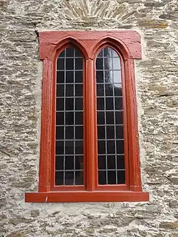 Der einjochige Chor mit Fünfachtelschluss ist gegenüber dem Schiff leicht eingezogen, überragt dieses aber.[6] Der Chor wird im Südosten durch ein gekuppeltes Spitzbogenfenster und im Osten von zwei hochrechteckigen Fenstern mit Holzgewänden belichtet und hat im Süden eine kleine Tür mit Holzrahmung. 1855 wurde der achtseitige verschieferte Dachreiter mit schlankem Schaft und spitzem Helm aufgesetzt, der von einem Turmknopf, Kreuz und Wetterhahn bekrönt wird.[6] Er beherbergt drei Glocken. Die ältere stammt noch aus vorreformatorischer Zeit und wurde laut Inschrift im Jahr 1473 gegossen: „Ave Maria, gratia plena, Dominus tecum, Anno Domini 1473“. Eine zweite Glocke von Friedrich Wilhelm Otto (Gießen) aus dem Jahr 1794 wurde im Ersten Weltkrieg an die Rüstungsindustrie abgeliefert, 1920 ersetzt, im Zweiten Weltkrieg abgeliefert und 1950 ersetzt. Eine dritte Glocke wurde 1970 angeschafft.[7] Im Inneren öffnet ein großer spitzbogiger Triumphbogen mit Quaderbemalung den Chor zum Kirchenschiff.