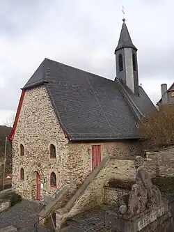Die Saalkirche aus unverputztem Bruchsteinmauerwerk im Ortszentrum gegenüber dem alten Rathaus ist nicht geostet, sondern nach Südost ausgerichtet. Sie wird von einem steilen verschieferten Satteldach mit Schopfwalm an der nordwestlichen Giebelseite abgeschlossen. Drei im Barock vergrößerte Fenster mit Stichbögen an der nordöstlichen Langseite versorgen den Innenraum mit Licht. Die Kirche wird an der Stirnseite im Nordwesten durch ein gotisches Spitzbogen-Portal erschlossen, das auf beiden Seiten von je zwei kleinen Fenstern in zwei Ebenen mit stumpfen Spitzbögen flankiert wird. An der aufgrund der Hanglage fensterlosen Südwestseite führt eine Außentreppe zur Emporentür unterhalb der Dachtraufe.