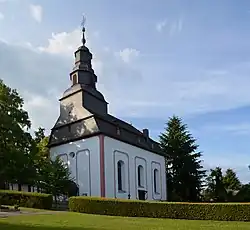 1260 wird eine Kirche erstmals urkundlich erwähnt. Eine Kirche wurde der Überlieferung nach 1755 abgebrochen, sie wird vermutlich am Platz der heutigen gestanden haben. 1756 erfolgte ein Neubau der Kirche (archivalisch bislang nicht belegt, aber zweimal an den Emporenstützen vermerkt). Diese Kirche gehörte zur reformierten Herrschaft Diez (die umliegenden Kirchen waren lutherisch) und war reformierte Mutterkirche für den Bereich bis Usingen. Es ist ein Saalbau mit dreiseitigem Schluss, Mansardendach und mehrfach abgestuftem Dachreiter. Das Vordach datiert nach 1900.