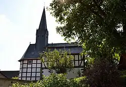 Das Schiff besteht daher im Untergeschoss aus Stein, im Obergeschoss aus an den Giebelseiten verschiefertem Fachwerk. Auf dem Pseudomansarddach befindet sich ein achteckiger Dachreiter mit Spitzhelm. Der kleine Fachwerkchor schließt dreiseitig. Das Westportal stammt von 1806.