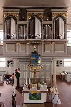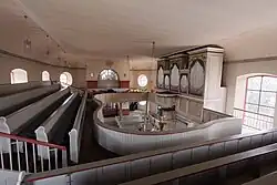 Eine geschwungene, hölzerne Empore zieht sich an drei Seiten des Kirchenschiffs entlang. Sie stammt aus der Bauzeit der Kirche[34] und wird von runden Säulen getragen.