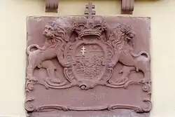 Das Hauptportal mit zweiflügeliger Kassettentür befindet sich im Fuß des Kirchturms, ein weiteres Portal an der Westseite. Ein früherer Eingang von der Kirchgasse wurde zugemauert.[29] Der Stichbogen des Hauptportals ist mit einem ornamentierten Schlussstein versehen.[30] Ein Sandstein-Relief über dem Hauptportal zeigt zwei Löwen, die das Wappen der Landgrafen von Hessen-Kassel halten. Das Relief ist eine Arbeit des Bildhauers Kister aus Hanau.[31] Unter dem Wappen befindet sich die Inschrift: