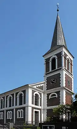 Der vorgesetzte Turm mit dem Eingang war mit einer stumpfen Haube abgeschlossen. Als man sich aufgrund von Spenden anlässlich des 200-jährigen Bestehens der Gemeinde 1885/86 drei Glocken anschaffen konnte, wurde das Turmdach durch die heutige Spitzhaube ersetzt. Die beiden größeren Glocken mussten im Zweiten Weltkrieg abgeliefert werden. Sie wurden 1954 durch zwei neue Bronzeglocken ersetzt.