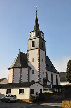 Der frühneuzeitliche Kirchenbau mit massivem Chor wurde 1911 abgerissen. 1912/1913 erfolgte der Neubau unter Verwendung von Teilen des Chors.[1] Die im Baustil der Neorenaissance nach einem Entwurf des Marburger Architekten Pesch errichtete Saalkirche, die Bauleitung übernahm der Regierungsbaumeister Kurt Abel. Die Kirche wurde am 19. Januar 1913 eingeweiht.