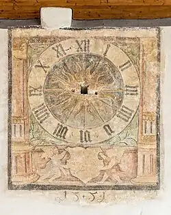 1934 wurden die Wandmalereien von 1420–1430[6] wiederentdeckt und als zusammenhängender Bildzyklus mit Darstellungen des Alten Testaments erkannt. Aus Zeit- und Kostengründen erfolgte die Freilegung durch die Kunstwerkstätte der Gebrüder Mezger aus Überlingen[7] lediglich in dem Bereich oberhalb der damaligen Westempore. Bei der Renovierung 1972/73 wurde dann auch die Malerei an der Nord- und Südwand des Kirchenschiffs wieder sichtbar gemacht. Es wird vermutet, dass auch der Chor (um 1528)[8] ausgemalt worden ist; dort beschränkte man sich aber auf die Freilegung einer auf die Wand gemalten Uhr, datiert auf 1551; weitere Fragmente sind unter der Tünche verborgen. 1984 erfolgte eine Bestandsaufnahme und Dokumentation der Malerei durch Hermann Kühn aus München.[9] In der Folge wurden immer wieder Konservierungsarbeiten zur Malschichtfestigung, Reinigung, Entsalzung und Unterfütterung der durch die Rissbildung des Gebäudes entstehenden Schäden durchgeführt.