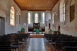 Im Inneren ist die Kirche mit einer flachen Holzdecke gedeckt. Der um eine Stufe erhöhte Chor mit polygonalem Abschluss wird durch zwei seitliche Stummelwände, in denen sich nördlich ein kleiner und südlich ein größerer rundbogiger Durchbruch befinden, optisch vom Kirchenschiff abgetrennt. Drei Spitzbogenfenster sind – wie alle Fenster der Kirche – klar verglast und haben kein Maßwerk. Im Chor befindet sich die einzige Tür, durch die der Turm zu erreichen ist.