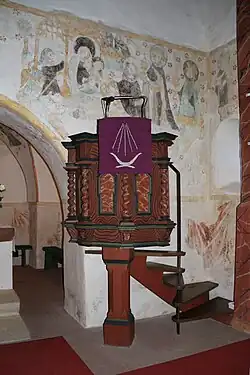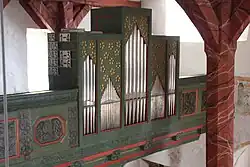 Die hölzerne Innenausstattung ist weitgehend in Rot- und Grüntönen gehalten. Die 1571 eingebaute, dreiseitig umlaufende Empore wies ursprünglich vierkantige Baluster auf, die im 18. Jahrhundert durch die heutigen Brüstungsbilder im Stil barocker Bauernmalerei ersetzt wurden. Die Profile der grünlich marmorierten Balken sind mit Rot abgesetzt. Die kassettierten Füllungen und die achteckigen Emporenpfosten sind mit Rankenwerk und floralen Motiven in Grüntönen bemalt. In den Zwischenfeldern wechseln sich geometrische und florale Motive ab. Die Balkenköpfe sind mit Blumen bemalt. Die Profile der Empore heben sich in Rot ab. Die Nordempore unter der Orgel trägt eine Inschrift, deren obere Zeile durch eine Überschalung halb verdeckt ist: „VESPERA · IAM · VENIT · NOBISCVM · CHRISTE · MANETO“ (Schon kommt der Abend. Bleib bei uns, Christus). Die untere Zeile lautet: „EXTINGVI · LVCEM · NE · PATIARE · TVAM“ (dulde nicht, dass dein Licht ausgelöscht wird).