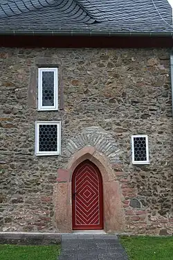 Möglicherweise diente der rechte Pfeiler einer kleinen Pforte aus rotem Sandstein, in den die Jahreszahl 1027 eingehauen gewesen sein soll, ursprünglich als Türfassung einer romanischen Vorgängerkapelle. Die Pforte wurde in die westliche Mauerumfriedung eingebaut und ist nach der letzten Instandsetzung dieser Mauer verschwunden.
