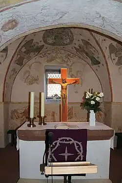 Der eingezogene Rechteckchor ist deutlich niedriger als das Schiff und hat ein Schopfwalmdach. Unter dem Dach sind die Balkenköpfe sichtbar. An jeder Seite ist ein kleines Rechteckfenster eingelassen. Ein niedriger Rundbogen öffnet den Chor zum Schiff. Der Chor hat ein Kreuzgratgewölbe über Blendnischen mit Spitzbogen.[1]