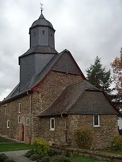 Das Schiff auf rechteckigem Grundriss (8,32 × 12,32 Meter) hat ein Satteldach mit einem mächtigen, achteckigen, verschieferten Dachreiter, der mittig aufgesetzt ist. Der Unterbau des Dachreiters beherrscht das Satteldach und reicht fast bis zur Traufe. Pultdächer vermitteln zu dem kleineren Obergeschoss, das als Glockenstube dient. Dort sind fünf kleine rundbogige Schalllöcher und Richtung Westen das Zifferblatt der Turmuhr angebracht. Eine geschwungene Haube wird von Turmknauf, schmiedeeisernem Kreuz und Wetterhahn bekrönt.[1] Die Spitzen der beiden Dreiecksgiebel sind verschiefert. Das Schiff wird an der Nordseite von drei kleinen Rechtfenstern und an der Südseite durch fünf kleine Rechteckfenster unterschiedlicher Größe und in unterschiedlicher Höhe belichtet.[6] Das spitzbogige Südportal mit grober Fase ist aus rotem Sandstein gefertigt. Das leicht spitzbogige Westportal mit Sandsteingewände hat einen hölzernen Vorbau, der am rechten Pfosten mit der Jahreszahl 1920 bezeichnet ist.[1] Das verschieferte Dach wird durch drei Holzpfeiler im Mittelschiff gesichert.