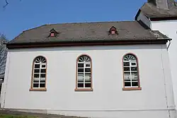 Die Kirche liegt auf einem kleinen Hügel am Ortsrand.[12] Einen großen Dorfbrand am 23. August 1798, dem 12 Gehöfte zum Opfer fielen,[6] überstand sie unbeschadet. Das Gebäude besteht aus einem Turm, einem Schiff und einem kleinen Eingangsvorbau. Das gesamte Mauerwerk ist in Bruchsteinbauweise errichtet und weiß verputzt. Ältester Teil ist der romanische Turm. Er wird auf die Zeit zwischen 1300 und 1350 datiert. Die Mauerstärke beträgt einen Meter. Seine schmalen Fensternischen waren als Schießscharten nutzbar, sodass von einer wehrhaften Nutzung auszugehen ist. Bei Grabungen im Turm in der ersten Hälfte des 20. Jahrhunderts entdeckte Lehrer Ludwig Schneider in zwei Metern Tiefe ein Einzelgrab mit einer männlichen Leiche. Anhand der aufgefundenen Sarggriffe datierte der Provinzialkonservator der Rheinprovinz, Edmund Renard, das Begräbnis auf das 14. Jahrhundert. Verbrannte Holzteile und Reste des Deckenverputzes im aufgeschütteten Boden deuteten zudem auf einen Brand des Turms hin. Inschriften im Gebälk des Turms verweisen auf eine Erneuerung von Glockenstuhl und Gebälk im Jahr 1680.[6]