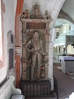 An der westlichen Chorwand ist das 3,50 Meter hohe und 1,05 Meter breite steinerne Grabdenkmal für den 1584 verstorbenen Georg Schutzbar genannt Milchling aufgestellt. Es zeigt den Ritter in seiner vollen Rüstung in einem Rundbogenfeld, das von zwei Pilastern mit Halbsäulen und vier Wappen flankiert wird. Den oberen Abschluss bilden eine Inschriftentafel und ein Gesims mit zwei Putten und dem auferstandenen Christus.[29] An der Südwand des Chors steht ein 2,18 Meter hohes und 0,99 Meter breites Epitaph für die sieben in den Pestjahren 1627 bis 1635 als Kinder gestorbenen Geschwister der Familie Buseck genannt Münch.[30][31]