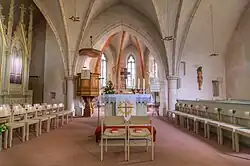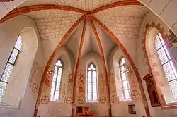 Der 5/8-Chor aus gotischer Zeit ist auf einem unregelmäßigen Grundriss errichtet.[16] Ein großer Spitzbogen vermittelt von der Vierung zum Chor. Das Chorgewölbe des 14. Jahrhunderts weist Birnstabrippen auf und ruht auf Wanddiensten.[25] Die drei östlichen Chorfenster weisen aus Sandstein gefertigte Maßwerke auf; im nördlichen Chorfenster ist das Maßwerk ausgebrochen. Das südliche Chorfenster ist aus Lungstein kunstvoll mit doppelter Kehle und Rundstäben gefertigt. Alle Chorfenster haben Spitzbögen.[26]