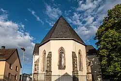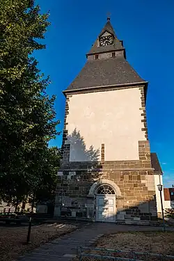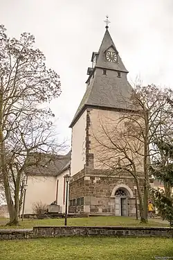 Der mächtige Kirchturm auf quadratischem Grundriss besteht im unteren, romanischen Teil aus aufgemauerten Quadern aus hellem Tuffstein und grauem Basaltgestein mit Ecklisenen. Ein umlaufendes Gesims in vier Metern Höhe ist mit einem Rundbogenfries verziert.[16] Das rundbogige, gestufte Westportal führt in eine Vorhalle, die das untere Drittel des Turms einnimmt.[17] Über der Halle mit Kreuzgratgewölbe befindet sich eine Turmkapelle, die wahrscheinlich dem heiligen Michael geweiht war, aber nicht vollständig ausgeführt wurde. An der Ostseite stehen noch zwei Ecksäulen mit grotesken Figuren und Blattwerk auf Kapitellen.[7] Eine 2,40 Meter breite Apsidiole, eine überwölbte Nische an der Ostseite, ist heute zugemauert. Die Kapelle ist über eine mittelalterliche, rundbogige Tür über der Nordempore des Schiffs zugänglich. Die verputzte obere Hälfte des Turmschaftes aus Bruchsteinmauerwerk mit Eckquaderung ist fensterlos und stammt aus gotischer Zeit.[18] Das vierseitige, verschieferte Pyramidendach ist zweistufig und wird in der Mitte durch eine schmale Zone mit je zwei kleinen rechteckigen Schalllöchern unterbrochen. Bekrönt wird das Dach von einem Turmknopf, Kreuz und Wetterhahn, der bereits für das Jahr 1611 nachgewiesen ist.[19]