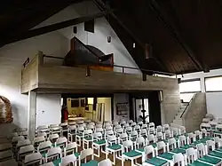 Der Gemeindesaal hat einen offenen Dachstuhl, der mit Holz verkleidet ist. Sich kreuzende Streben stützen das Sparrendach, das an der Nordseite ein durchlaufendes Fensterband als Oberlicht hat. Der Altarbereich liegt im Westen. An der Westwand sind 13 barocke Ölgemälde angebracht, die zentral Christus mit 10 Aposteln zeigen, die außen von Mose und Aaron flankiert werden.[8] Darunter sind Kanzel, Altar und Lesepult aufgestellt, die alle schlicht und funktional aus Holz mit Eisenrahmen gefertigt sind. Die Kirche ist mit weißen Einzelstühlen bestuhlt und bietet 250 Besuchern Platz. An der Ostwand, der Rückseite des Turms, ist eine Orgelempore eingebaut, auf der die Orgel vor einer Rundbogennische steht.