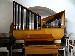 Von einer Orgel ist erstmals im Jahr 1710 die Rede, als der Schulmeister entlohnt wird. 1727 und 1783 folgten Reparaturen. Orgelbauer Dreuth arbeitete 1770 an den Bälgen und führte 1795 Wartungsarbeiten aus. Die Gemeinde beschloss 1796 eine Vergrößerung der Orgel um einige Register durch Orgelbauer Johann Peter Rühl aus Gießen. Hugo Böhm aus Gotha schuf 1890 ein neues Werk mit zehn Registern auf zwei Manualen und Pedal.[13] Günter Hardt aus Möttau errichtete im Jahr 1972 eine neue Orgel, die über acht Register verfügt, die sich auf zwei Manuale und Pedal verteilen. Der Prospekt wird durch zwei offene trapezförmige Kästen geprägt. Die vorderspielige Orgel hat folgende Disposition:[14]