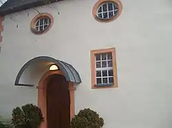 Die Kirche auf rechteckigem Grundriss hat starke Außenmauern, die auf das 13. Jahrhundert hinweisen.[1] Sie wird durch ein spätromanisches Westportal (1,22 Meter breit, 2,21 Meter hoch) mit Rundbogen über Kämpferplatten mit Schräge, das später überdacht wurde, und durch ein rechteckiges Südportal (0,73 Meter breit, 1,72 Meter hoch) erschlossen.[17] Rechteck- und Rundfenster belichten den Innenraum. Unter dem verschieferten Westgiebel sind zwei und in der südlichen Chorwand ein Rundfenster eingelassen, in der Südseite des Schiffs zwei und an der Ost- und Westseite je ein Rechteckfenster. Die Nordseite ist fensterlos. Die roten Gewände (0,12 Meter breit) aus Basalt stammen aus dem 18. Jahrhundert und heben sich von den mittelalterlichen Umrahmungen ab.[18] Über dem Südportal ist eine Schrifttafel mit Girlanden und Putten angebracht, die auf den Umbau in den Jahren 1810/1811 hinweist: „Diese Kirche ist erbaut und Renoviert worden im Jahr Christi anno 1810 und 1811. Der bau-Meister ist gewesen Johann Konrad Keil“.[14]