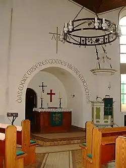 Die holzgedeckte Saalkirche ist ein verputzter Bruchsteinbau auf einer Höhe am Rande des Ortes mit dreiseitigem nach Osten gerichteten Chorabschluss. Die Kirche ist 20,30 m lang und 11,40 m breit. Am südlichen Portalvorbau ist eine Grabplatte mit einem stehenden Ritter und einer nicht mehr lesbaren Umschrift in gotischen Minuskeln eingelassen.[2][3] Die Kirche wurde 1978–1979 im Inneren vollkommen umgestaltet. Durch den Einbau einer Querwand wurde der Kirchenteil auf den Ostteil verkürzt und im Westteil ein Gemeindezentrum eingerichtet. Die barocke Kanzel mit kronenartigem Schalldeckel wurde versetzt. Da der barocke Orgelprospekt verloren ging, wurde er durch einen modernen ersetzt.[2]