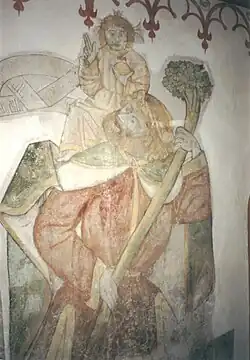 Die Kirche war dem heiligen Christophorus geweiht. An der nördlichen Innenwand befindet sich eine aus der Entstehungszeit der Kirche stammende Wandmalerei, die u. a. den heiligen Christophorus darstellt, der sich dem auf seinem Nacken knienden Christuskind zuwendet. Im Zuge der Reformation wurde das Gemälde übertüncht und blieb danach jahrhundertelang verborgen. Erst 1912 wurde es im Rahmen einer Renovierung wiederentdeckt und freigelegt.[14] Bei der anschließenden Restaurierung durch den Kölner Restaurator Anton Bardenhewer fügte dieser einige zeitgenössische Ergänzungen hinzu.[9]