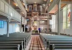 Der barocke Saalbau mit vier Achsen besitzt umlaufende mehrgeschossige Emporen, auf der nördlichen und westlichen Seite drei-, im Süden zweigeschossig. Im Osten befindet sich der prächtig geschmückte Kanzelaltar, hinter dem die Orgelempore angebracht ist. Die Bleiglasfenster wurden um 1900 eingebaut.