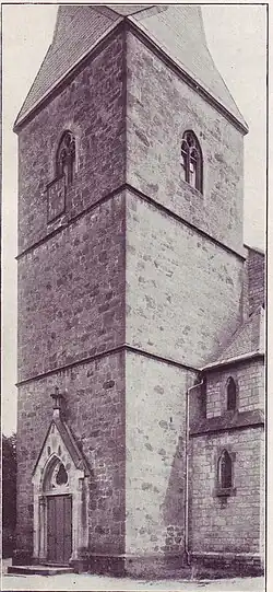Im Innenraum des Turms ist seit 1971 eine Gedenkstätte zur Erinnerung an die Opfer des Ersten und Zweiten Weltkriegs eingerichtet. Im Zuge der Umgestaltung ersetzte man das neugotische Portal durch eine modern anmutende Tür mit Bronzetafeln.