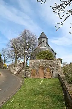 Der nicht geostete, sondern nach Nordost ausgerichtete Saalbau aus verschiefertem Fachwerk ist im Norden des alten Ortskerns weithin sichtbar erhöht errichtet.[1] Die Kirche ist auf der äußeren ringförmigen Burgmauer südöstlich des Schlosses unterhalb der Burg erbaut.[1]