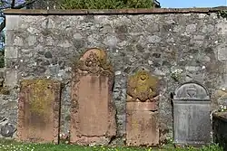 Auf dem Kirchhof sind vier Grabsteine sekundär in die Mauer der Schlossstraße südwestlich der Kirche vermauert. Drei Grabmäler aus rotem Sandstein stammen aus dem Barock. Das linke, hochrechteckige Epitaph von 1705 hat ein großes Schriftfeld, das an den Seiten von Girlanden aus Blumen und Schleifen und oben mit Akanthus und Voluten abgeschlossen wird. Im mittleren Grabstein von 1741 ist unter einem Rundbogen ein Wappenschild zu sehen, der von zwei Engeln gehalten wird. Das Schriftfeld wird von Blüten und Ranken gerahmt. Das dritte Epitaph für Johannes Zisler (1602–1664), Schultheiß zu Königsberg, zeigt den Verstorbenen als Halbfigur über zwei Inschriftenfeldern.[12] Der graue Grabstein für Wilhelm Ernst Fri(e)drich Schulz (1737–1814), großherzoglich-hessischer Regierungsrat und Amtmann in Königsberg, mit einer Urne unter dem bekrönenden Rundbogen ist vom Klassizismus geprägt.[1]