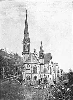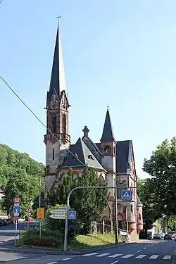 Die Evangelische Kirche steht auf einem dreieckigen Grundstück an der alten Auffahrt zur Pfaffendorfer Brücke. Die neugotische Emporenkirche bildet den Grundriss eines lateinischen Kreuzes. Der durch den Geländeanstieg hohe Sockel besteht aus Grauwacke, die Wandflächen aus heimischem beigen Tuff mit Architekturgliederungen aus rotem Sandstein. Der polygonale Chor ist nach Norden ausgerichtet, die kurzen Querarme mit Blendgiebeln zeigen zu den umgebenden Straßen. In den südlichen Ecken des Chors stehen auf der Westseite auf quadratischem Grundriss ein kleiner Turm und auf der Ostseite auf sechseckigem Grundriss der Hauptturm. Dieser ist hoch aufragend mit einem Glockengeschoss, das von einer zwölfeckigen verschwenkten Balustrade umgeben ist, und dem abschließenden Spitzhelm.