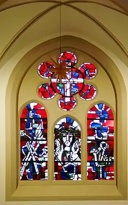 Im Zuge der Renovierung von 1966 wurden sie durch neue, helle Glasfenster mit Bleifassung in verschiedenen Breiten des Künstlers Manfred Freitag aus Oberbillig ersetzt. Das mittlere Fenster hinter dem Altar zeigt den segnenden, dornengekrönten Christus. Die flankierenden Fenster zeigen die Marterwerkzeuge und in der Rosette darüber wird ein Kreuz dargestellt. An den Seitenwänden und der Rückwand sind die Fenster rein ornamental gestaltet und bestehen aus farbigen und durchsichtigen, kleinen Glasscheiben.[11]