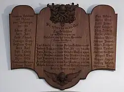 Die Gedenktafel für die Gefallenen Soldaten des Ersten Weltkriegs 1914–1918, die heute über der Sakristeitür hängt, wurde 1920 in einem Trauergottesdienst enthüllt und hing jahrelang über der Ein- und Ausgangstür neben dem Altar. Nach dem Zweiten Weltkrieg wurde sie links und rechts durch zwei Flügel erweitert.
