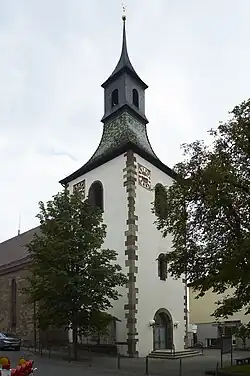 Die 1832 nach Plänen von Karl Marcell Heigelin errichtete Saalkirche besteht aus dem Langhaus, dem eingezogenen, gerade geschlossenen Chor im Osten und dem vom Vergängerbau übernommenen ehemaligen Chorturm im Westen. Dessen oberstes Geschoss beherbergt die Turmuhr und den Glockenstuhl für zwei Kirchenglocken und ist mit einem geschwungenen Pyramidendach abgeschlossen, das von einer schiefergedeckten Laterne bekrönt wird.