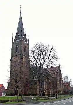 Die Grundsteinlegung der neugotischen Hallenkirche aus Quadermauerwerk erfolgte am 26. April 1888, die Einweihung am 13. Juli 1892. Sie wurde nach einem Entwurf des Architekten Heinrich Hutze aus Barkhausen anstelle eines gotischen Vorgängers aus dem 17. Jahrhundert erbaut, und besteht aus einem Kirchturm im Westen, einem Langhaus, einem Querschiff und einem eingezogenen, dreiseitig geschlossenen Chor im Osten. Die Außenwände werden von Strebepfeilern gestützt, die des Kirchturms laufen als Fialen aus. Das oberste Geschoss des Kirchturms beherbergt hinter den Klangarkaden den Glockenstuhl. Im Giebel darüber befinden sich die Zifferblätter der Turmuhr.