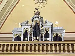 Die barocke Orgel von 1697 wurde von einem unbekannten Orgelbaumeister gebaut und ist ein Geschenk des Geschäftsmanns Johann Ujházi. Sie wurde mehrmals überholt, darunter 1837 nach der Versetzung in die heutige Kirche und hat heute 13 Register, verteilt auf ein Manual und Pedal. 1932 erwarb die Gemeinde eine neue Orgel der Fabrik Gebrüder Rieger mit 29 Registern, seither steht die alte Orgel auf der Seitenempore. Sie ist nicht mehr spielbar und wird nicht gewartet, der Pfeifenbestand ist aber fast vollständig erhalten.[3][4]