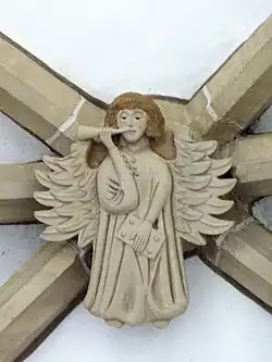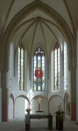 Im Chor sind fünf romanische Bögen erhalten, die von der ehemaligen Kapelle des Wilhelmitenklosters stammen. Aus dieser Anfangszeit stammt auch die seitlich angebaute Sakristei. Seine heutige Gestalt und seine spätgotischen Fenster erhielt der Chor in der Mitte des 15. Jahrhunderts.[10][11] Abweichend zu diesen jüngeren Befunden hatte Oechelhäuser 1909 noch den gesamten Chor zu einer spätgotischen Anlage erklärt.[9] Zwei Schlusssteine zieren die Rippenbögen des Chores. Auf dem einen sieht man zwei Gesichter, und der andere stellt einen Engel dar. Dieser Engel des Jüngsten Gerichts hat eine Posaune an den Mund gesetzt und hält in der linken Hand das Buch der Weissagung (vgl. Offenbarung des Johannes 10,1–11).