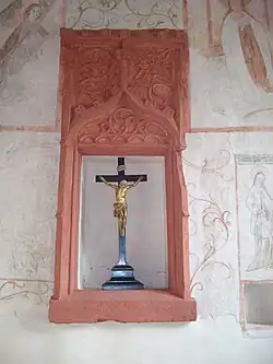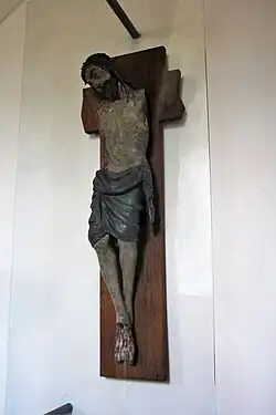 Ein hölzernes Kruzifix aus der Zeit um 1400, das lange im Laubacher Schloss aufbewahrt wurde, gab Graf Karl Georg zu Solms-Laubach im Jahr 2003 der Kirchengemeinde zurück.[29] Die separat angefertigten Arme von Kreuz und Korpus sind verloren gegangen. Das Kruzifix in leichter S-Haltung ist farblich durch eine zweite Fassung verändert worden. Es enthält zwei kleine Reliquienpakete mit Knochensplittern des heiligen Burkard und der Maria Magdalena. Im Jahr 2006 kehrte das gotische Kunstwerk nach zweijähriger Restaurierung durch Barbara Dietz in die Münsterer Kirche zurück. Art und Entstehungszeit lassen eine Zuordnung zum Typus der Mystiker- und Pestkreuze vermuten.[30] Es wurde an der Nordwand der Taufkapelle hinter einer Sicherheitsglasplatte angebracht.