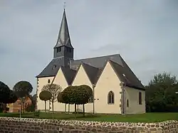 Die dreischiffige Hallenkirche am westlichen Ortsrand ist aus Bruchsteinmauerwerk aus Basalt errichtet. Sie ist an den alten Westturm angebaut und um zwei Ostchöre erweitert. Die Gliederungen des Gebäudes bestehen aus Lungstein. Der umlaufende abgeschrägte Sockel bezieht nicht das nördliche Seitenschiff ein. Teils erhalten ist die wehrhafte Mauerumfriedung, die an der Nordseite zwei Schießscharten aufweist.[2] Der Kirchhof wurde bis 1831 für Bestattungen genutzt.[13]