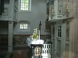 Die Holzdecke des Innenraums ist als Himmel ausgestaltet. Sehenswert sind die beiden Emporen und der reich verzierte Kanzelaltar aus dem ersten Drittel des 18. Jahrhunderts. Die zweite Empore trägt die Orgel, die bis unter die Holzdecke reicht und einen Prospekt mit prächtigen barocken Schnitzereien und figürlichen Darstellungen musizierender Engel trägt.