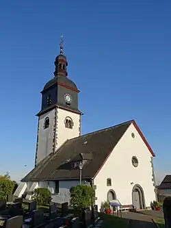 Die geostete Kirche am östlichen Dorfrand inmitten eines ummauerten Friedhofs entstand unter Einfluss der Arnsburger Bauhütte. Sie erhält durch die zweischiffige Anlage und der nördlichen Sakristei Züge einer (unsymmetrischen) Basilika.[7]