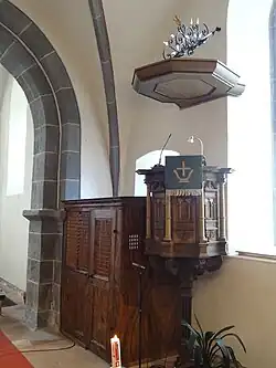 Der achteckige, holzsichtige Kanzelkorb mit reichen Füllungen stammt aus der Mitte des 17. Jahrhunderts.[10] Er ruht auf einem viereckigen, profilierten Holzpfosten mit vier lebhaft geschwungenen Bügen. Die mit Beschlagwerk üppig ausgestatteten Kanzelfelder werden durch Freisäulen gegliedert. Der schlichte Schalldeckel wird von einem schmiedeeisernen Rankenwerk gehalten. Unter der Kanzel schließt sich der Pfarrstuhl mit durchbrochenem Gitterwerk an, der den Kanzelaufgang verbirgt.