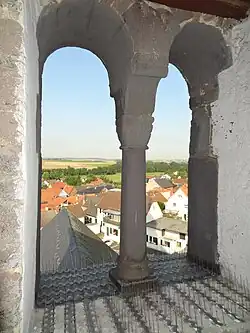 Der aufgemauerte Turm ist auf quadratischem Grundriss errichtet und hat Eckquaderung. Der Turmschaft ist ungegliedert. Im Obergeschoss sind gekuppelte Rundbogenfenster mit steinernen Säulen eingelassen. Der hölzerne Turmhelm von 1750 ist verschiefert. Dem kubusförmigen Glockengeschoss ist eine achtseitige offene Laterne mit Welscher Haube aufgesetzt, die von einem Turmknopf, Kreuz und Wetterhahn bekrönt wird. Vorbild für den Turmhelm war der Sprendlinger Helm aus dem Jahr 1718.[9] An der Ostseite ist eine kleine eingezogene, ungewölbte Apsis angeschlossen. Der Chor im Turmuntergeschoss hat ein Kreuzgewölbe, dessen Schlussstein mit einer Rose belegt ist. Zur Nordseite hin ist ein kleines romanisches, zur Südseite hin ein zweiteiliges spätgotisches Fenster mit Maßwerk angebracht.[8] An der Nordseite des Turms ist eine Sakristei angebaut, die von einer Rundbogentonne abgeschlossen wird. Die südliche Außenmauer des Turms wird durch einen Strebepfeiler gestützt, der bis an die angrenzende Traufe des Schiffs reicht. Nicht ganz diese Höhe erreicht ein mächtiger Eckpfeiler an der Süd-Ost-Ecke des Turms.