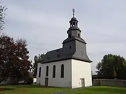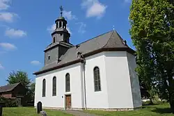Das Gotteshaus wird von einem geschieferten Satteldach bedeckt. Der dreigeschossige Dachreiter im Westen ist ganz verschiefert und verjüngt sich nach oben: Über einem Kubus geht die achteckige Haube in eine offene Laterne über, die von Turmknopf, Kreuz und Wetterhahn bekrönt wird. Nach drei Jahren Restaurierung wurde im Jahr 2014 die Turmspitze wieder aufgesetzt; Knopf und Wetterhahn sind neu vergoldet und die Jahreszahl 1728 im schmiedeeisernen Kreuz auf das Dorf ausgerichtet. Die Glockenstube beherbergt ein Dreiergeläut mit den Tönen f1, as1 und c2, also einem Mollakkord.