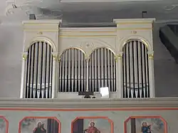 Ein unbekannter Orgelbauer schuf 1736 eine einmanualige Orgel mit neun Registern, die kein oder ein nur angehängtes Pedal hatte. Das Werk wurde 1881 von Ludwig Eichhorn aus Weilmünster renoviert, umdisponiert und mit einem selbstständigen Pedal versehen. Im Jahr 1910 baute Hugo Böhm aus Gotha die heutige Orgel mit zehn Registern, die auf zwei Manuale und Pedal verteilt sind. Der Prospekt wird durch Pilaster in vier rundbogige Pfeifenfelder gegliedert. Das Werk wurde von Werner Bosch überholt. Die Disposition lautet wie folgt:[15]