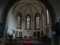 Der Innenraum des Langhauses sollte ursprünglich eingewölbt werden, wie seine Strebepfeiler vermuten lassen, er wurde jedoch mit einer Flachdecke überspannt. Zur Kirchenausstattung gehört eine Kanzel von 1760, die aus dem Kloster Bronnbach stammt.