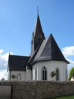 Die nach Nord-Ost ausgerichtete Saalkirche liegt am südwestlichen Dorfrand inmitten eines ummauerten Friedhofs. Sie ist aus Bruchstein-Mauerwerk errichtet, das verputzt ist. Die Gewände der Fenster und andere Gliederungselemente sind aus Lungstein. Das Gotteshaus hat einen leicht eingezogenen Chor mit 5/8-Schluss. Das dreijochige Schiff weist Kreuzrippengewölbe auf, die an der Südseite angebaute spätgotische Kapelle auf quadratischem Grundriss und der Chor ein Sterngewölbe. Das Dachgebälk von Schiff und Chor ist noch original. An der Südwand ist ein Hagioskop vermauert.[6] Der mittige aufgesetzte, quadratische Dachreiter hat vier Dreiecksgiebel, die in einen achtseitigen Spitzhelm übergehen. Der Dachreiter ist wie das Satteldach des Schiffs komplett verschiefert und wird von Turmknopf, Kreuz und Wetterhahn bekrönt.