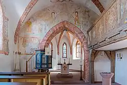 Im Chor und in der Kapelle wurden 1954 und über dem Triumphbogen 2001/02 Reste spätgotischer Wandmalereien freigelegt. Über dem Bogen ist das Weltgericht dargestellt, zentral über dem Bogenscheitel der Richterstuhl Christi und rechts davon der Höllensturz. Auf der linken Seite ist die Himmelspforte zu sehen, das Fresko links der Kanzel wird als Reicher Mann und armer Lazarus gedeutet.[9] Rechts des Chorbogens ist die Kreuzigungsszene wegen der umgesetzten Empore teils zerstört. Fresken an der östlichen Kapellenwand und an der nördlichen Chorwand zeigen eine(n) Heilige(n) (möglicherweise die hl. Dorothea) mit Stifter, in der Kapelle unter einem Kielbogen mit Rankenwerk.[1] Die Gewölberippen sind in Rottönen marmoriert gefasst und enden in runden Schlusssteinen, die mit Vierpass, Rose und Wappenschild belegt sind. Um die Schlusssteine sind Flammenornamente aufgemalt.